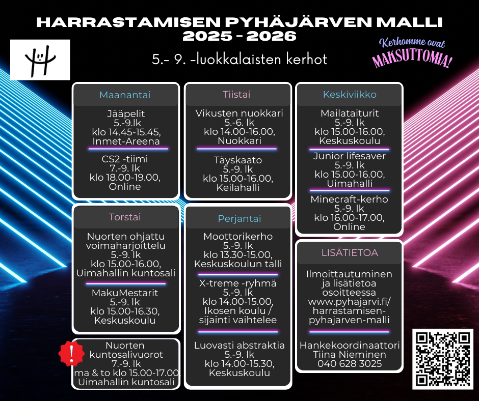 Harrastamisen Suomen mallin tavoitteena on mahdollistaa jokaiselle lapselle ja nuorelle mieluisa ja maksuton harrastus koulupäivän yhteydessä. Pyhäjärvi on ollut mukana Harrastamisen Suomen mallissa syksystä 2022 lähtien. Harrastustarjonta valitaan vuosittain lasten ja nuorten toiveiden perusteella. Mikäli osallistujalla on jokin toiminnallinen rajoite ja/tai este osallistua kerhoihin, tarjoamme maksutta hänelle omaa harrastuskaveria. Harrastuskaveri osallistuu kerhoon yhdessä lapsen/nuoren kanssa, jotta jokaisella olisi tasavertaiset mahdollisuudet olla mukana menossa. Koulukyydit ovat normaalisti oppilaiden käytettävissä, mikäli aikataulut sopivat yhteen kerhojen kanssa. Tutustu kerhotarjontaan ja ilmoittaudu mukaan sähköisellä lomakkeella perjantaina 15.8.2025 klo 12.00 alkaen. Paikkoja on rajoitetusti ja ne täytetään ilmoittautumisjärjestyksessä. Mikäli jäit ilman kerhopaikkaa, ota yhteyttä hankekoordinaattoriimme, Tiina Nieminen puh. 040 628 3025.